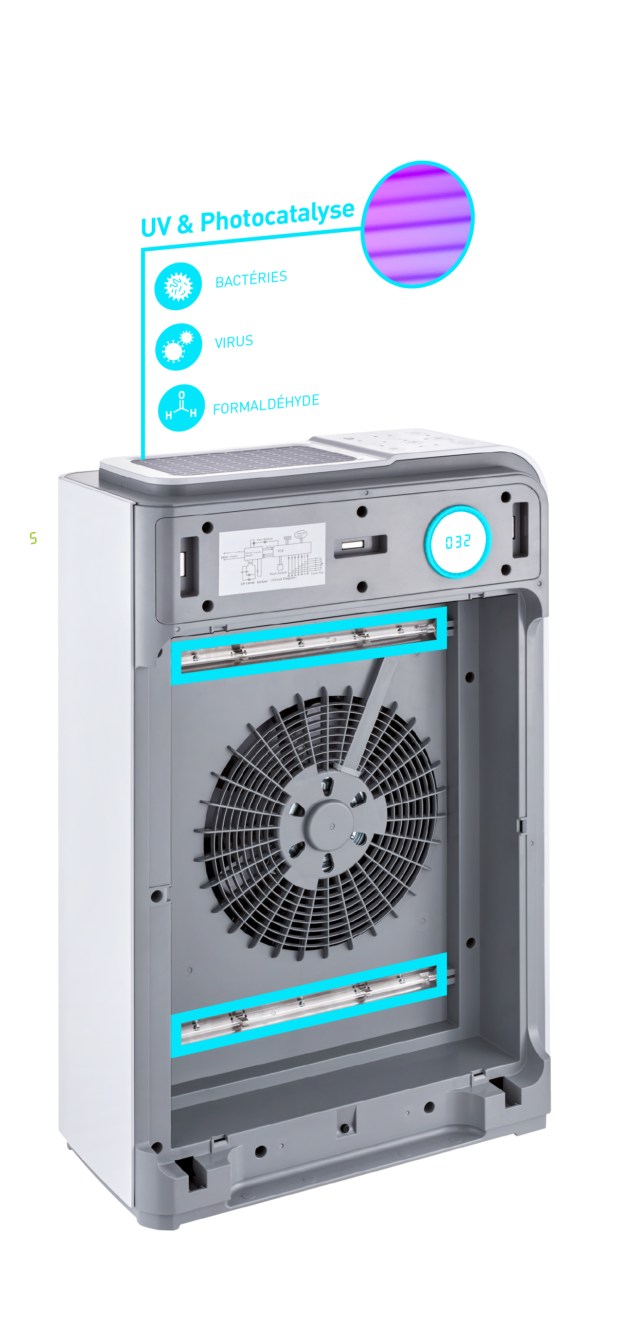 - L'air passe au niveau de la photocatalyse, activée avec les lampes UV. Les dernières particules fines, transformées en gaz carbonique et en vapeur d'eau, sont alors éliminées.